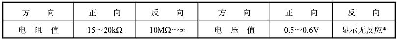 注:在反向接法进行“二极管”档测试时,虽然二极管反向漏电极小,但由于反向电阻很大,根据欧姆定律U=IR,使得二极管两端的反向电压仍比较大,一般为3V左右,但为什么“显示无反应”呢?这是因为子啊设计数字万用表的“二极管”档时,为了方便判断对二极管极性的测试,特意将此档采用2V量,使在反极性测试时因实测电压3>2V而过载,所以这是显示无反应,显示屏仍显示过载。无疑这对准确判断二极管的极性,极间短路,开路提供了方便。